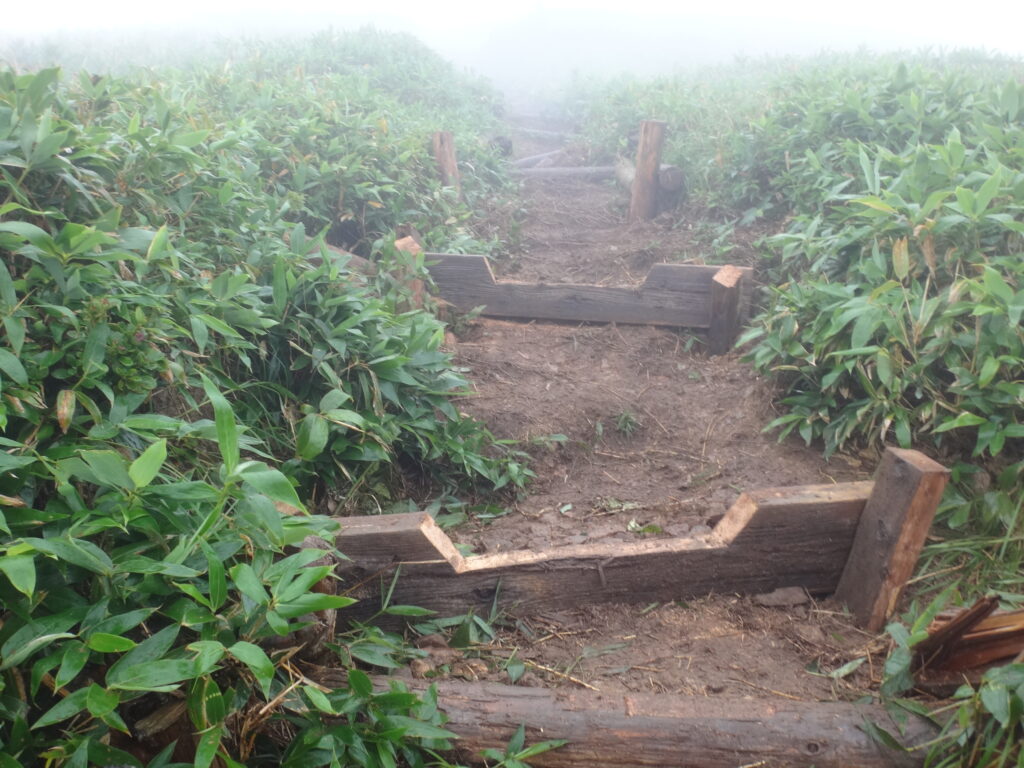 この場所は、土が流れてしまって段差が高くなり、登山道脇の笹が踏みつけられてしまっていました。