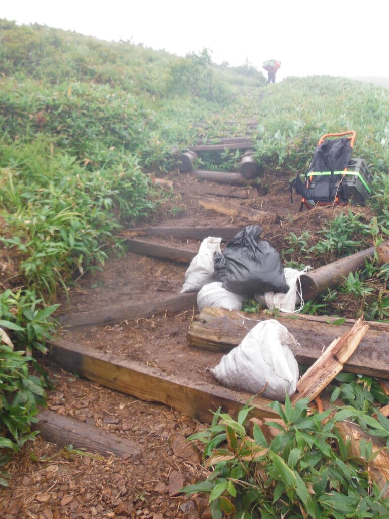 私の参加した班はステップづくり。木道が壊れてしまった場所は多くの登山者が歩いたため、2、3か月でかなり踏み固められていました。